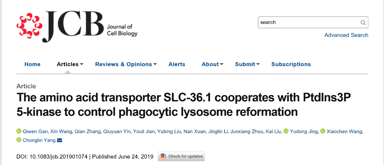 2019年6月24日,细胞生物学著名期刊The Journal of Cell Biology以Article形式在线发表了云南大学生命科学中心/生命科学学院杨崇林实验室的研究论文“氨基酸转运蛋白SLC-36.1协同磷脂酰肌醇-3磷酸激酶调控吞噬溶酶体的再形成”(The amino acid transporter SLC-36.1 cooperates with PtdIns3P 5-kinase to control phagocytic lysosome reformation)。