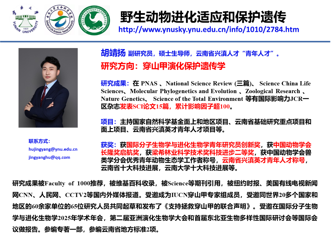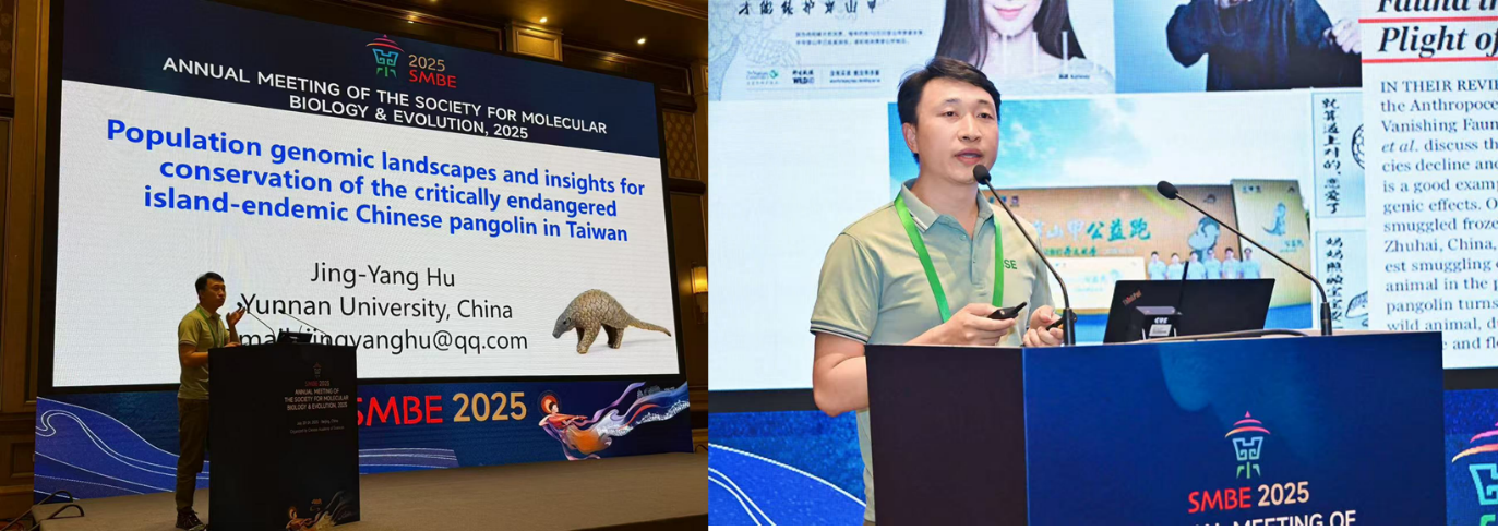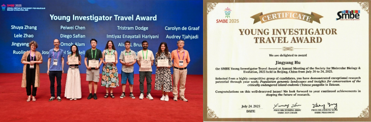 2025 年 7 月 20 -24日,国际分子生物学与进化生物学2025年学术年会(the Annual Meeting of the Society for Molecular Biology & Evolution 2025,简称SMBE2025)在北京会议中心成功举办。ky开元集团于黎研究团队胡靖扬副研究员荣获2025年国际分子生物学与进化协会青年研究员创新奖(Young Investigator Travel Award),并受邀在Conservation Genomics专题以“Population genomic landscapes and insights for conservation of the critically endangered island-endemic Chinese pangolin in Taiwan”做报告。