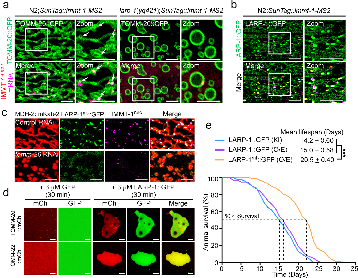 2. SunTag-scFvMS2-MCP系统可视化LARP-1介导的IMMT-1/ATP-2局部翻译过程(a);IMMT-1/ATP-2mRNA和新生多肽与码头共定位(b);对TOM 复合物组分的 RNAi 处理显著减少了 码头的数量,破坏了线粒体的结构(c);TOM 复合物组分能够被分选至LARP-1 蛋白凝聚体中(d);码头锚定在线粒体上时,显著延长线虫的寿命(e)。