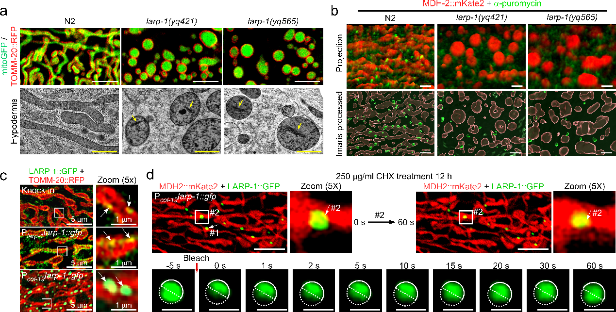 1. larp-1突变体,成虫表皮细胞线粒体呈球状异常结构,并伴随嵴结构破坏(a);LARP-1 依赖性的蛋白质合成发生在线粒体表面bLARP-1在体内,以浓度依赖的方式驱动液-液相分离(LLPS)(c),在线粒体上形成具有内部流动性的凝聚体(d)。