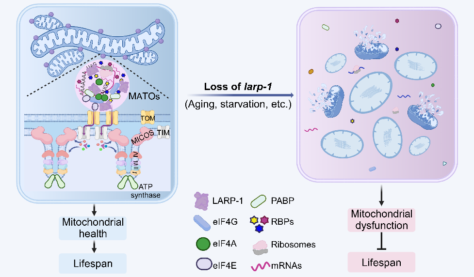 2025910日,云南大学生命科学研究中心杨崇林研究团队,在自然衰老期刊Nature aging 上发表了题为: Mitochondria-associated condensates maintain mitochondrial homeostasis and promote lifespan 的研究成果。该研究直接揭示线粒体上的蛋白凝聚体作为蛋白质翻译的场所码头(mitochondria-associated translation organelles, MATOs )”, 原位合成线粒体蛋白,码头TOM 复合物互作,共翻译转运进入线粒体,维持其结构和功能。在胁迫和衰老条件下,码头会解聚,线粒体结构和功能随之破坏。反之,锚定在线粒体上的码头可以维持胁迫或衰老过程中的线粒体健康,延长机体寿命