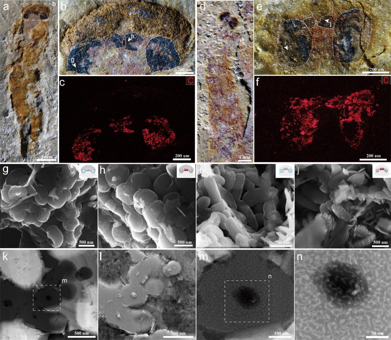2 澄江生物群中两种昆明鱼类的相机型眼(虚线显示,a–f)、黑素体形态(g–j)以及超显微结构(k–n