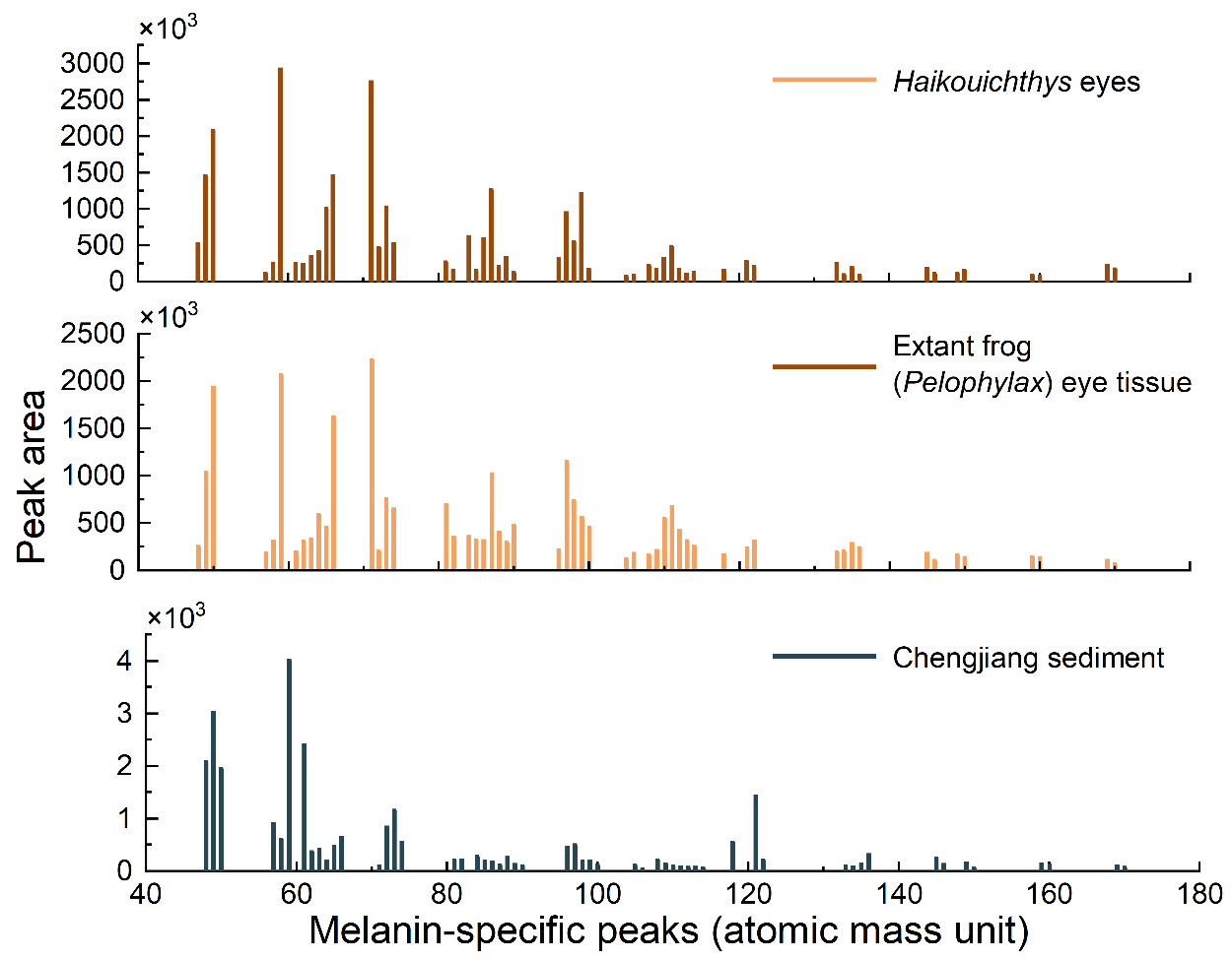 3 澄江生物群昆明鱼类的眼(a)、现生蛙眼(b)黑素体以及围岩(c54个黑色素特征峰的ToF-SIMS负离子质谱