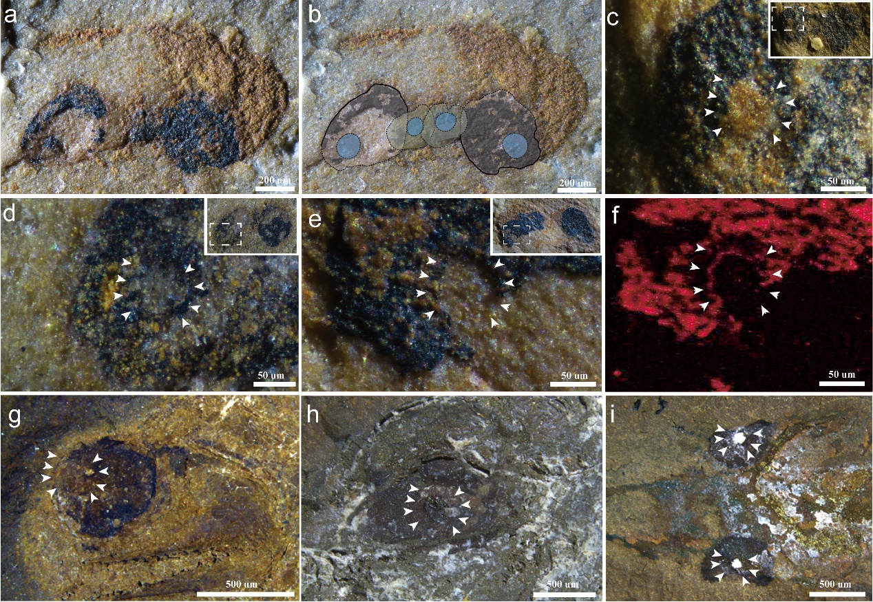 4 澄江生物群昆明鱼类(af)和其它脊椎动物化石(gi)眼睛中保存的晶状体结构