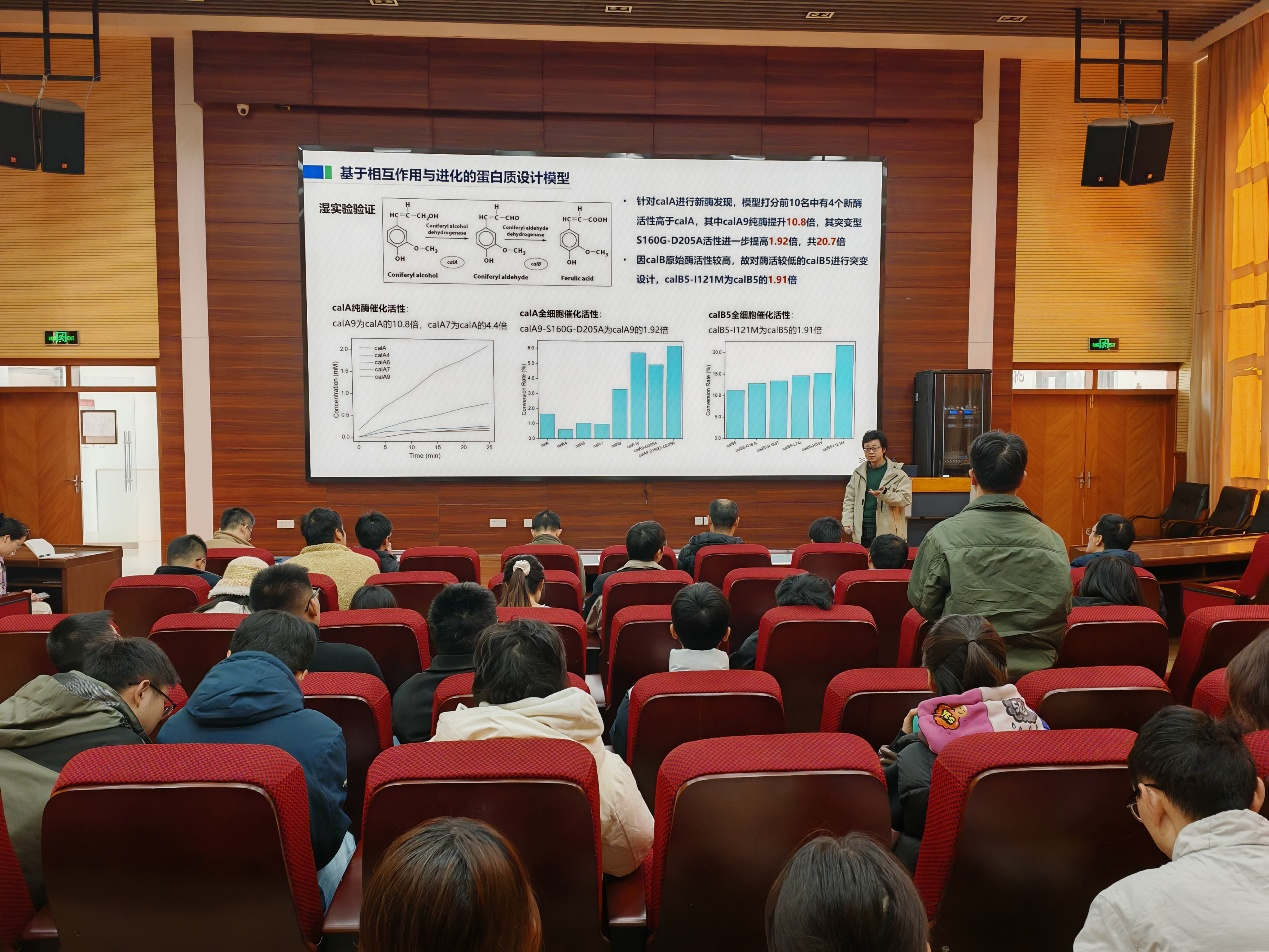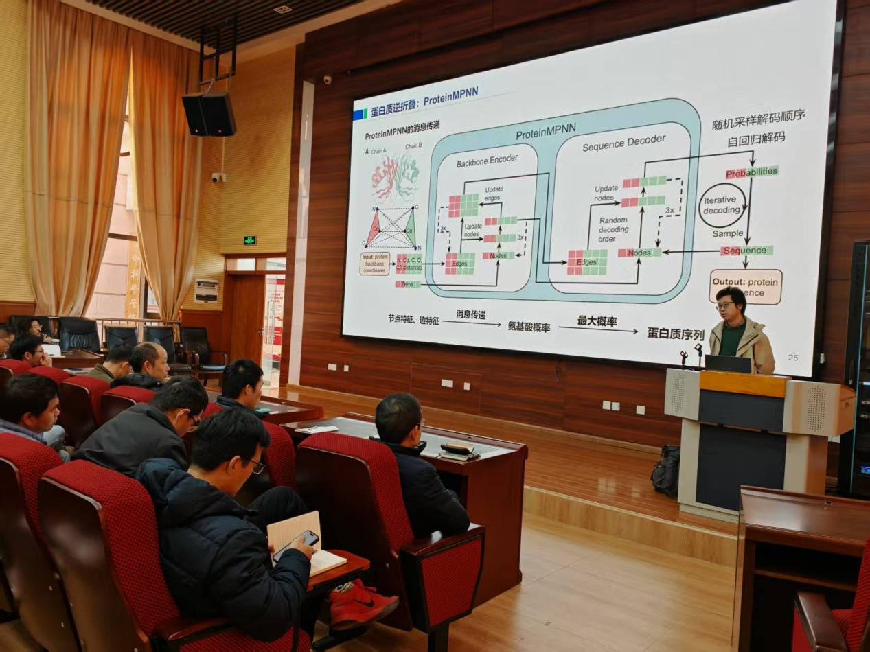 作为本次行程的重要环节,郑良振博士在学院学术报告厅作了一场主题鲜明、内容深刻的前沿学术报告。报告以基于深度学习的蛋白质口袋设计为题,聚焦人工智能在生命科学领域的创新应用,系统阐释了人工智能技术从基础研究走向产业落地的多元场景,让在场师生对人工智能的跨领域价值有了更为全面的理解。郑博士指出,当前生命科学与计算科学的交叉融合已进入双向奔赴的黄金契机,跨学科人才的协同合作将催生更多颠覆性创新。他提出了先用、再评估、最后改造的务实路径建议,为学院师生开展人工智能相关研究提供了清晰指引。郑博士深入浅出的讲解引发了师生们的广泛共鸣,报告现场氛围热烈。互动环节中,大家踊跃提问、积极交流,学术思想的碰撞让在场师生均感收获颇丰。