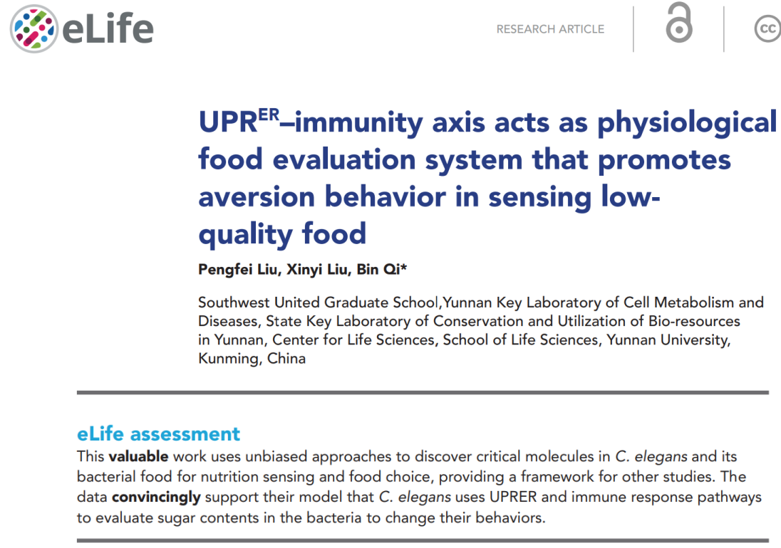 2024年9月5日,ky开元集团/中心祁斌课题组在eLife以“UPRER–immunity axis acts as physiological food evaluation system that promotes aversion behavior in sensing low-quality food”为题,报道了细胞应激(UPRER-immunity)参与评估食物质量并调整摄食行为的机制。
