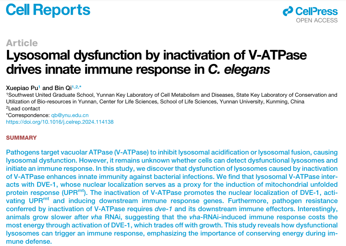 病原菌能够靶向V-ATPase,抑制溶酶体酸性和融合,从而导致溶酶体功能障碍。然而,细胞能否检测到功能失调的溶酶体并启动免疫反应的机制尚不清楚。2024年4月28日,云南大学生命科学中心祁斌课题组在Cell Reports上以“Lysosomal dysfunction by inactivation of V-ATPase drives innate immune response in C. elegans”为题,报道了溶酶体功能紊乱(V-ATPase失活)激活先天免疫的机制。