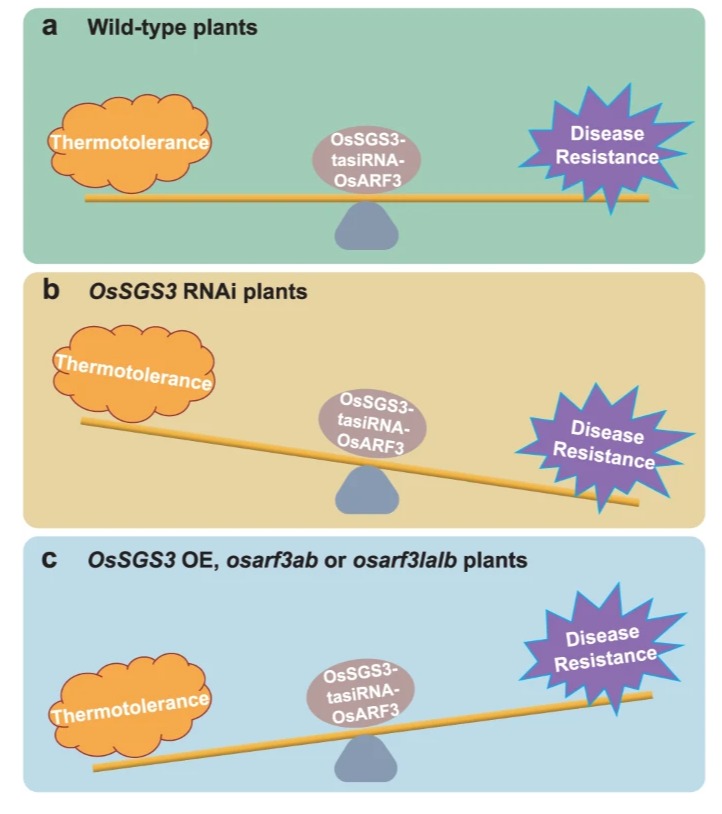 图:OsSGS3-tasiRNA-OsARF3模块平衡水稻生物胁迫响应与耐热性的模型。OsSGS3 RNAi植株以损失耐热性为代价提高了抗病性,而在OsSGS3 OE osarf3abosarf3lalb中,植株的耐热性增加但抗病性减弱。