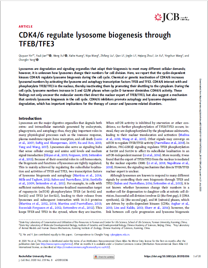 Lysosomes are degradation and signaling organelles that adapt their biogenesis to meet many different cellular demands;however,it is unknown how lysosomes change their numbers for cell division. Here, we report that the cyclin-dependent kinases CDK4/6 regulate  lysosome biogenesis during the cell cycle. Chemical or genetic inactivation of CDK4/6 increases lysosomal numbers by activating the   lysosome and autophagy transcription factors TFEB and TFE3. CDK4/6 interact with and phosphorylate TFEB/TFE3 in the nucleus,    thereby inactivating them by promoting their shuttling to the cytoplasm.During the cell cycle,lysosome numbers increase in S and G2/M phases when cyclin D turnover diminishes CDK4/6 activity. These findings not only uncover the molecular events that direct the      nuclear export of TFEB/TFE3, but also suggest a mechanism that controls lysosome biogenesis in the cell cycle.CDK4/6 inhibitors       promote autophagy and lysosome-dependent degradation, which has important implications for the therapy of cancer and lysosome-     related disorders.