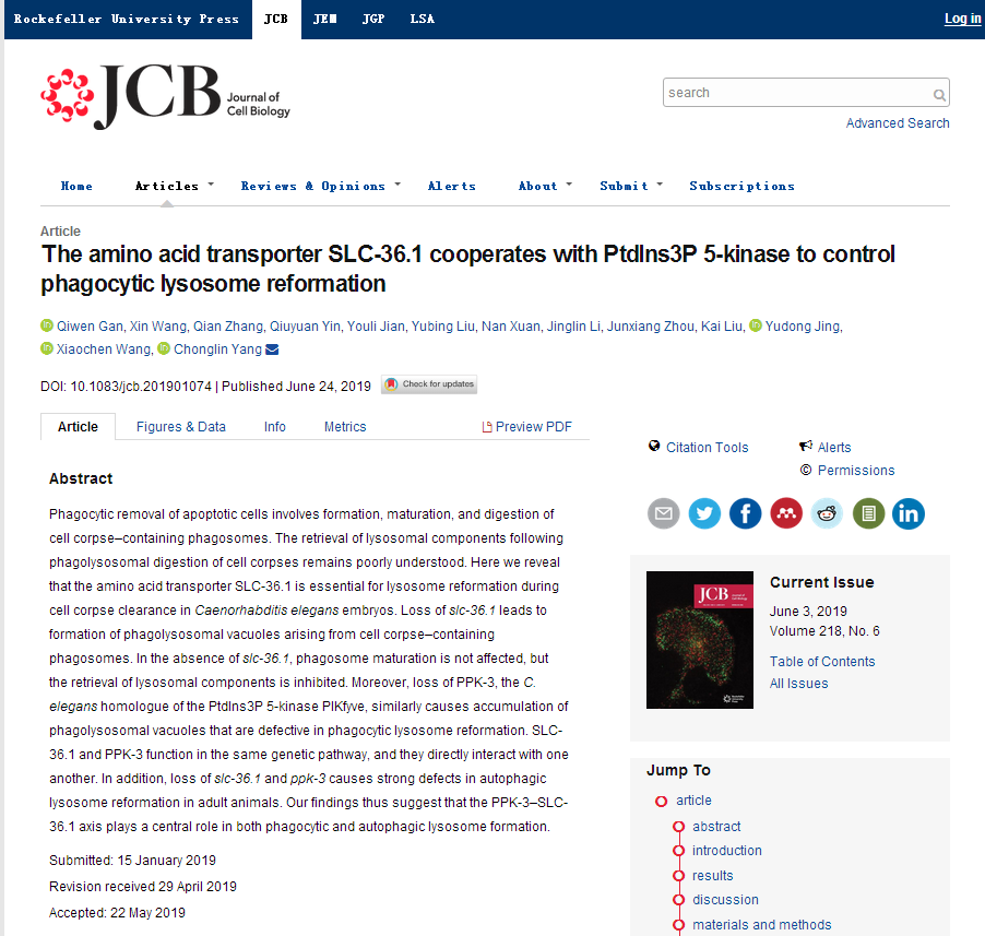 Phagocytic removal of apoptotic cells involves formation, maturation,and digestion of cell corpse–containing phagosomes.The retrieval of lysosomal components following phagolysosomal digestion of cell orpses remains poorly understood.Here we reveal that the amino acid transporter SLC-36.1 is essential for lysosome reformation during cell corpse clearance in Caenorhabditis elegans embryos. Loss of slc-36.1 leads to formation of phagolysosomal vacuoles arising from cell corpse–containing phagosomes.In the absence of slc-36.1,phagosome maturation is not affected,but the retrieval of lysosomal components is inhibited.Moreover, loss of PPK-3, the C. elegans homologue of the PtdIns3P 5-kinase PIKfyve, similarly causes accumulation of phagolysosomal vacuoles that are defective in phagocytic lysosome reformation. SLC-36.1 and PPK-3 function in the same genetic pathway,and they directly interact with one another.In addition,loss of slc-36.and ppk-3 causes strong defects in autophagic lysosome reformation in adult animals. Our findings thus suggest that the PPK-3–SLC-36.1 axis plays a central role in both phagocytic and autophagic lysosome formation.