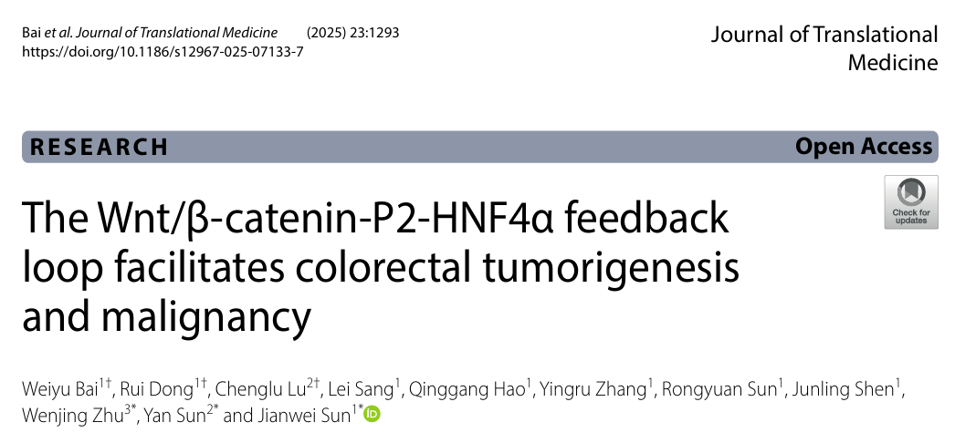 2025年11月,ky开元集团孙建伟研究团队联合天津医科大学孙燕与康复大学朱文静团队在结直肠癌研究领域取得重要进展。相关研究型论文“The Wnt/β-catenin-P2-HNF4α feedback loop facilitates colorectal tumorigenesis and malignancy”近日在线发表于国际权威期刊 Journal of Translational Medicine。