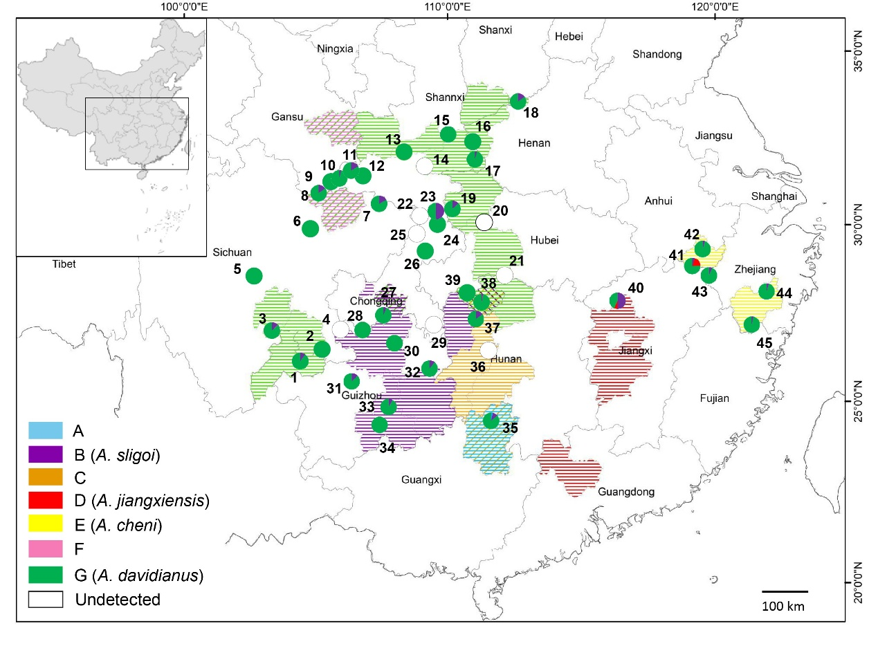 2 基于eDNA揭示大鲵各隐存种当前野外分布与历史范围对比图(引自论文Figure 2)。图中颜色代表不同隐存种(定义参照Yan et al., 2018与Liang et al., 2019)。阴影区域为历史分布范围,数字编号点为本次eDNA采样点,圆形色块表示该点检测到的物种。