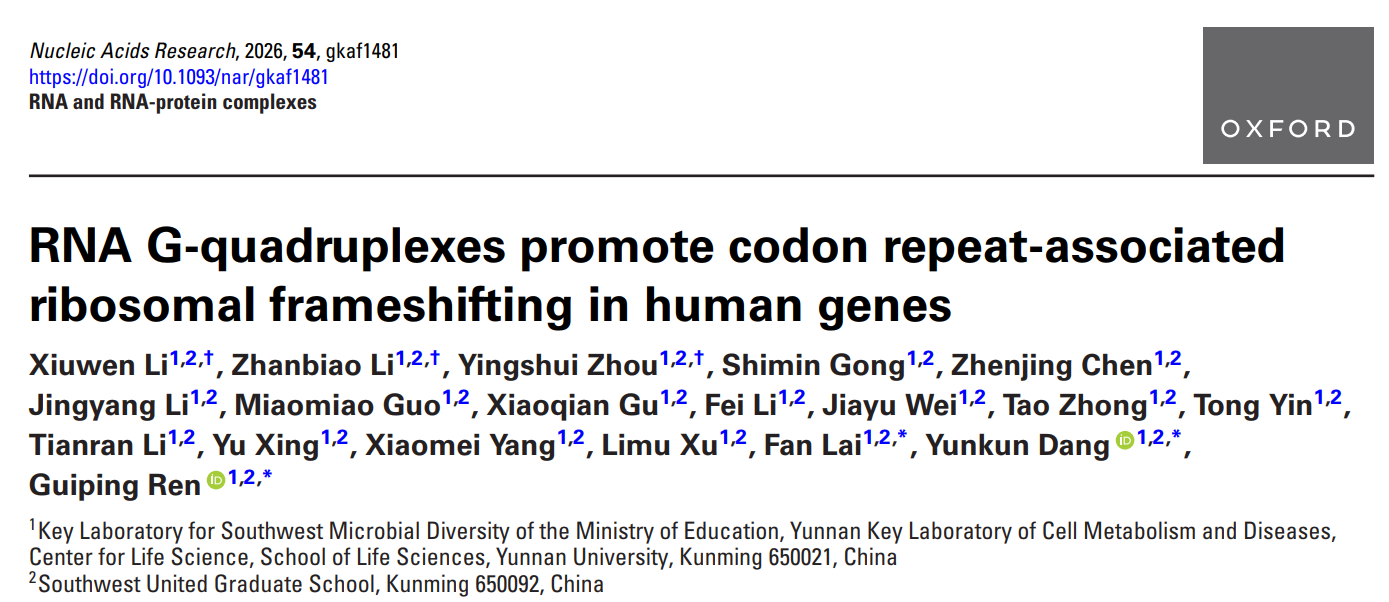 2026年1月16日,ky开元集团党云琨/赖凡研究团队合作,在国际知名学术期刊《核酸研究》(Nucleic Acids Research,IF=16.8)上发表题为“RNA G-quadruplexes promote codon repeat-associated ribosomal frameshifting in human genes”的研究论文。该研究首次揭示RNA G-四链体(rG4)作为关键顺式调控元件,通过促进密码子重复相关核糖体移码(CRFS),驱动基因翻译重编程的新机制,为理解人类蛋白质组复杂性和基因调控多样性提供了新视角。