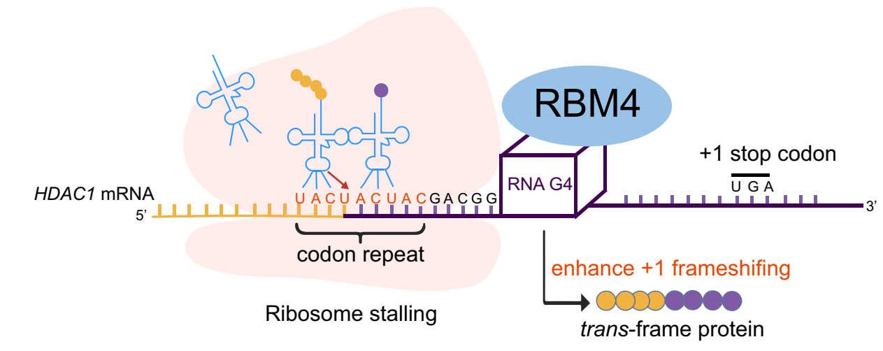 核糖体在翻译过程中通常严格遵循mRNA的既定阅读框,但在特定信号介导下可发生“程序性核糖体移码”,即核糖体切换阅读框继续翻译,使单一基因产生多种功能不同的蛋白质。团队前期研究发现,组蛋白去乙酰化酶1(HDAC1)基因中(UAC)₃密码子重复序列可引发高效移码,其产物参与细胞迁移与凋亡等关键生命过程(Nucleic Acids Research, 2024),但其分子调控机制尚未明确。