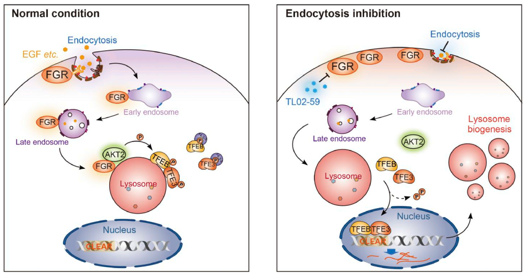本研究揭示了一条从质膜到溶酶体、最终调控细胞核转录的完整信号轴,即 FGR‑AKT2‑TFEB/TFE3通路。该通路受内吞活动动态调控:当内吞活跃、生长信号充足时,质膜定位的FGR随内吞过程转运至溶酶体,激活并招募AKT2,进而磷酸化并抑制TFEB/TFE3,从而限制溶酶体的过度生成;反之,当内吞受阻或营养匮乏时,该抑制信号被阻断,TFEB/TFE3得以活化,驱动溶酶体生物发生以增强降解与代谢回收能力。