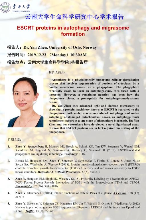 云南大学生命科学中心学术报告—Dr. Yan Zhen, University of Oslo“ESCRT proteins in autophagy and migrasome formation”