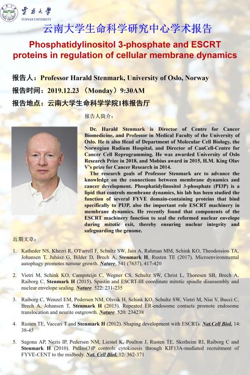 云南大学生命科学中心学术报告—Professor Harald Stenmark, University of Oslo“Phosphatidylinositol 3-phosphate and ESCRT proteins in regulation of cellular membrane dynamics”