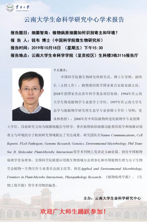 云南大学生命科学中心学术报告 - 中国科学院微生物研究所钱韦研究员 “细菌智商:植物病原细菌如何识别寄主和环境”