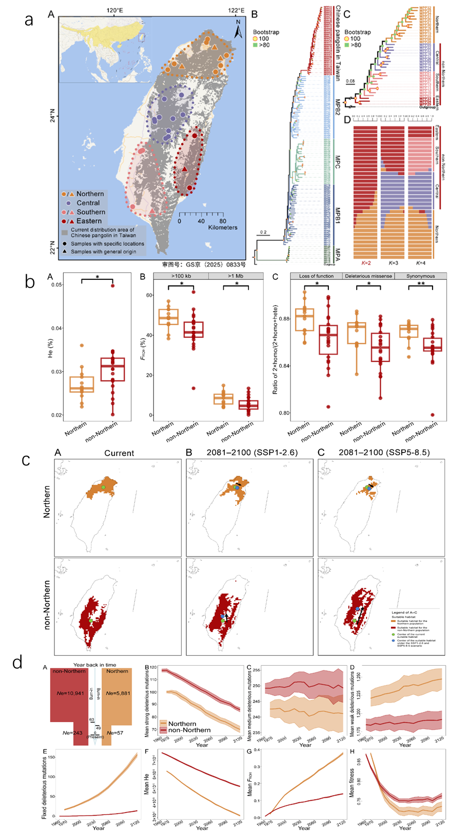 图1台湾穿山甲的采样信息和群体结构分析(a),台湾穿山甲两个群体的基因组遗传后果分析(b),台湾穿山甲未来的栖息地的生态位模拟(c)和未来生存潜力模拟(d)。