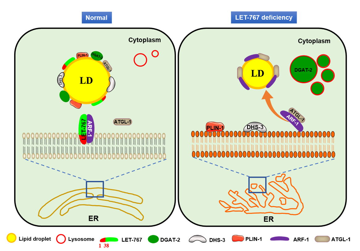梁斌团队等利用秀丽线虫易于遗传筛选的优势,寻找调控脂滴大小的基因和信号通路(Genetics, 2016Journal of Lipid Research20132017Nature Communications2018Journal of Cell Biology, 2021Cell Reports2022Journal of Biological Chemistry2022)。在本研究中,他们筛选同时影响脂滴大小和脂滴蛋白脂滴定位的基因,发现编码羟基类固醇脱氢酶(HSD)成员的LET-767功能受阻时,导致三种已知脂滴蛋白的LD定位异常:DHS-3(短链脱氢酶/还原酶),PLIN-1(围脂蛋白)和DGAT-2(二酰基甘油o-酰基转移酶2),并且阻止秀丽线虫脂滴的生长。在正常情况下(图1左),LET-767存在于内质网(ER)和脂滴上,与ARF-1相互作用,阻止ARF-1的脂滴定位和ATGL-1的募集,从而维持适当的脂质稳态和脂滴蛋白DHS-3PLIN-1DGAT-2的脂滴定位。在LET-767功能障碍的情况下(图1右),ARF-1被释放,并将ATGL-1招募到脂滴进行脂肪分解,但抑制DHS-3PLIN-1DGAT-2靶向到脂滴。LET-767缺乏也会改变ER形态(图1)。
