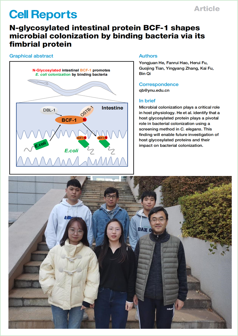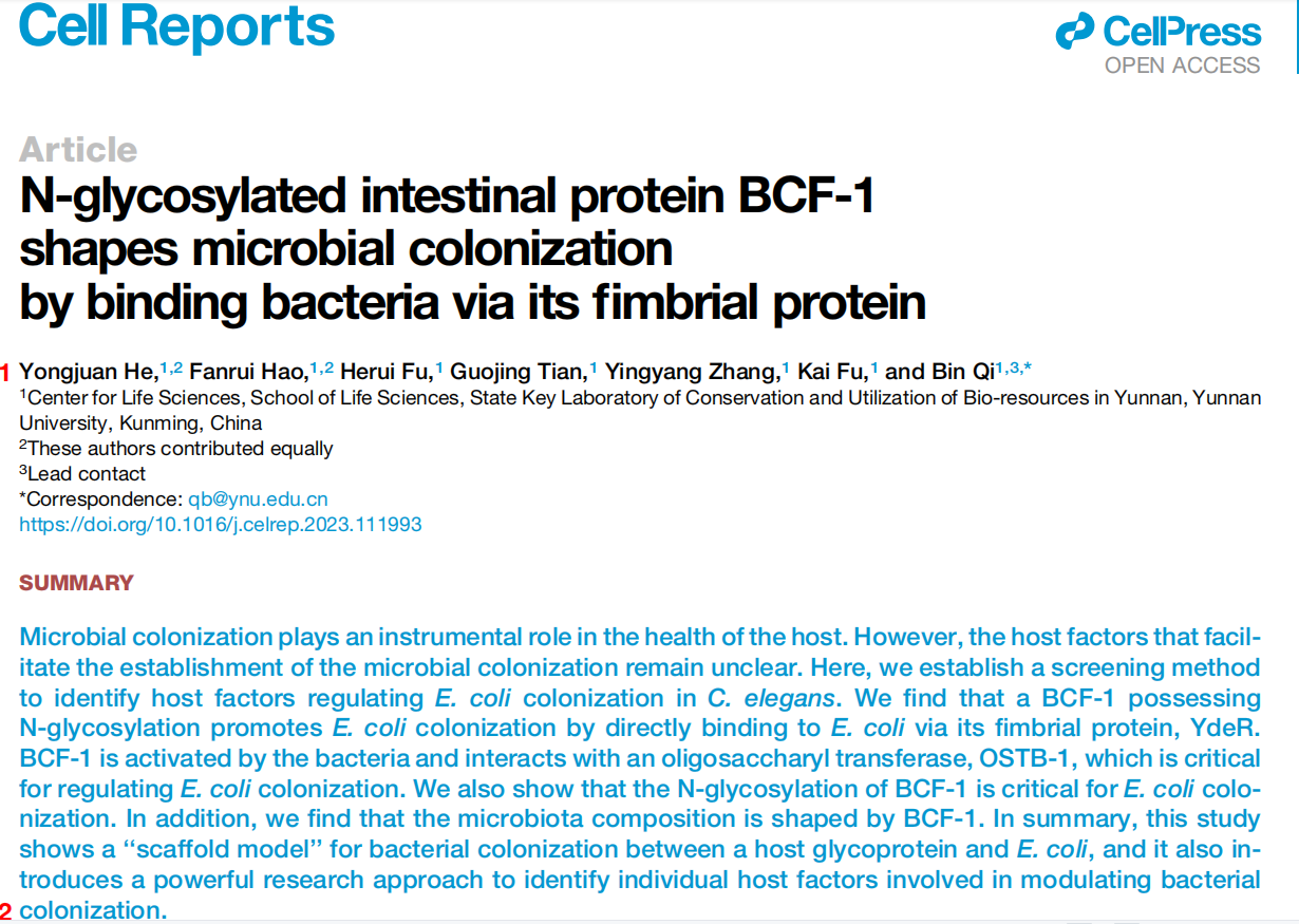 2023年1月18日,云南大学生命科学中心祁斌课题组在Cell Reports上以“N-Glycosylated Intestinal Protein BCF-1 Shapes Microbial Colonization by Binding Bacteria via its Fimbrial Protein”为题,报道了宿主N-糖基化蛋白BCF-1通过与细菌菌毛蛋白互作调控肠道菌定植的机制