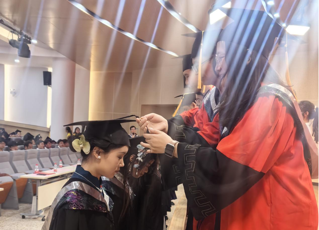 激动人心的学位授予环节,院长优秀导师代表们集体上台,为同学们扶正流苏,授予学位。