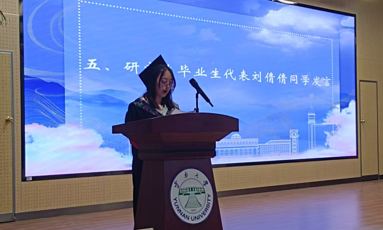 2021博士研究生刘倩倩作为研究生毕业生代表发言。她回顾求学过程中遇到的挑战与磨练,那些拼搏的日夜,已化作身后的璀璨星河,照亮前行至此的道路。与各位同学共勉,愿未来道路上,铭记从事生命科学研究的初心,在专业领域继续深耕,保持学习与进步,为二十一世纪生命科学的发展贡献自己的青春力量。