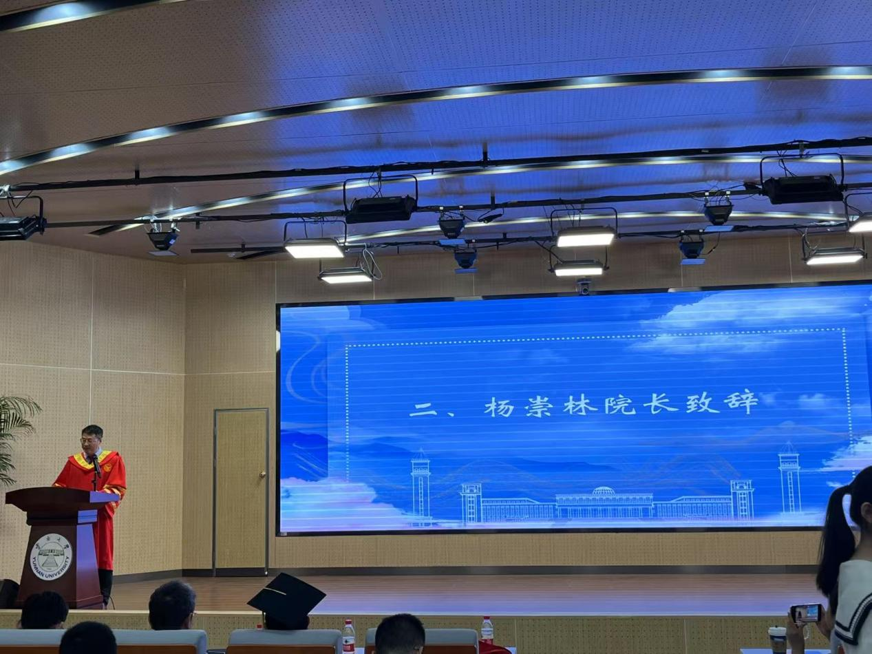 院长杨崇林教授致辞。他代表学院向毕业生们表示热烈祝贺,向悉心培育、关心及支持同学们的导师、亲友和师生员工表示衷心感谢!