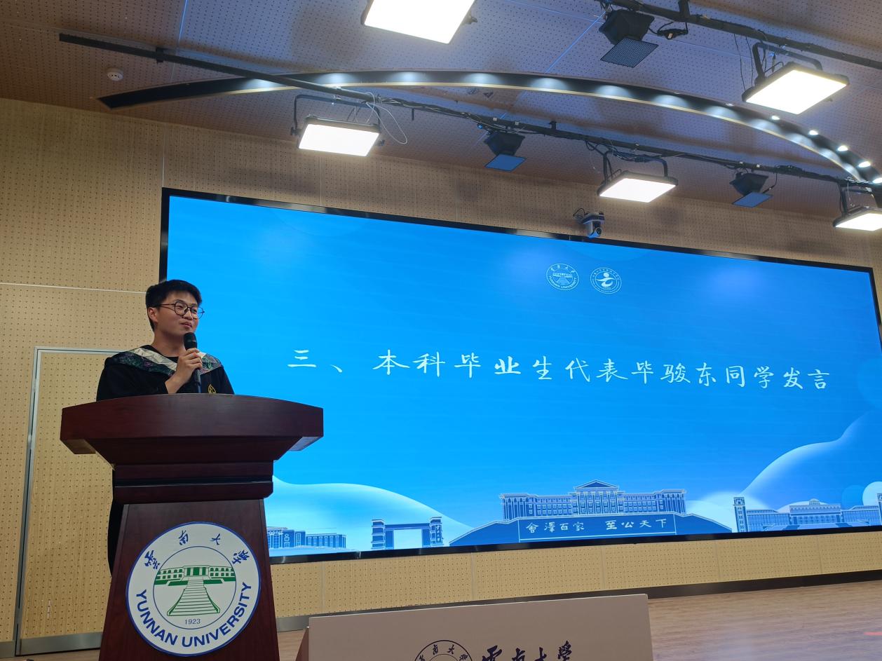 2020级本科生毕骏东作为本科毕业生代表发言。回顾本科学习的经历,他诚恳地感谢了学院老师和同学们所提供的鼓励、支持和热心帮助,分享自己充实、丰富的学习所获,也分享了对云大校园生活的热爱。他表示,将与同学们一起带着对生活的热爱,勇敢地去探索未知世界的无限可能,勇敢地去选择自己所热爱的事业,创造属于自己的无悔人生,做一个有理想、有担当的青年。