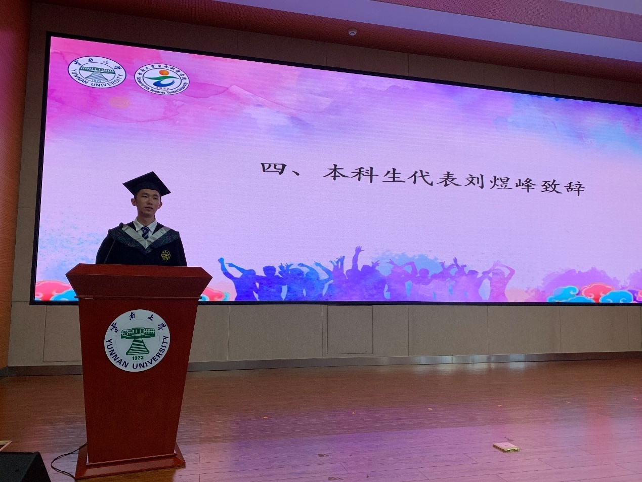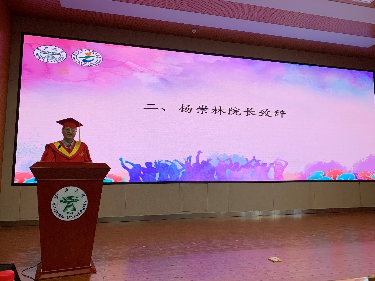 杨崇林院长在典礼上致辞,代表学院向2021届全体毕业生表示最热烈的祝贺,向辛勤教导的老师和悉心养育的家长表示最诚挚的问候和最衷心的感谢。面对突如其来的新冠肺炎疫情,同学们更加体会到生命科学对人类生命健康的影响,面对不期而遇的考验,希望同学们秉承“会泽百家,至公天下”的云大精神,以高远的格局、宽广的视野、勇敢地踏上人生广阔的舞台。