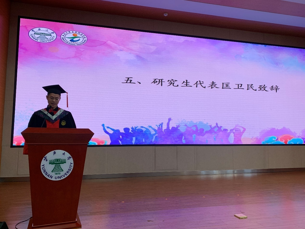研究生毕业生代表匡卫民同学发言。他以幽默语言回顾学习生涯,表达对学院、学校的感激,给师弟师妹们提出学好专业技能、珍惜学习时光的建议,与毕业同学们共约立志,定不负众望将自己的青春绽放在祖国最需要的地方,攻坚克难,为生命健康事业发光发热。祝愿我们的母校明天会更好!