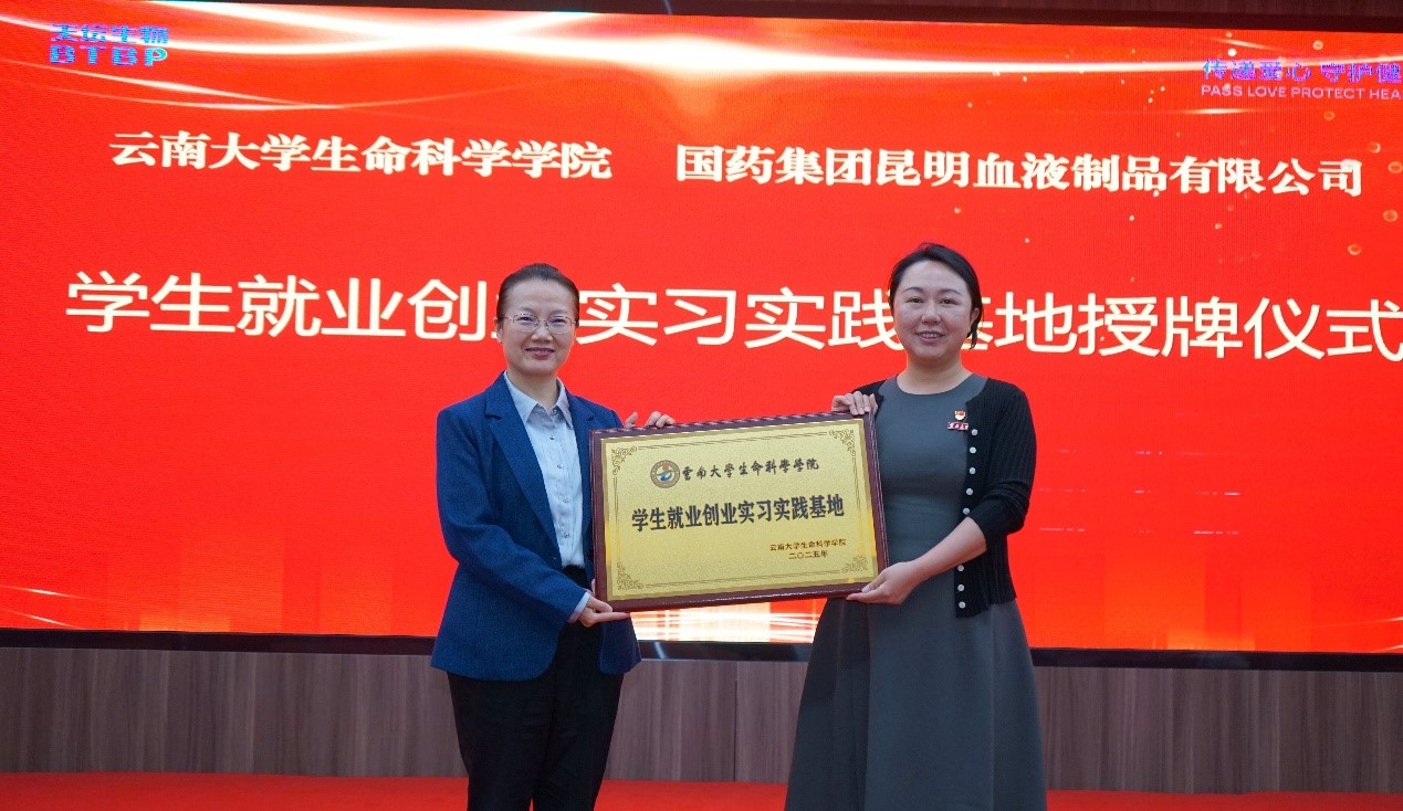 学院副书记何雨洋向国药集团昆明血制公司授予ky开元集团就业创业实习实践基地牌匾,副院长王永华与昆明血制总经理江砚芳共同签订并交换学生实习实践基地建设和合作协议。