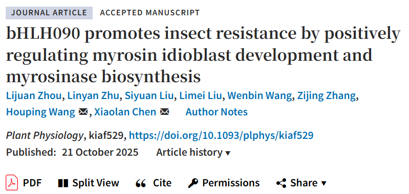 Plant Physiology|陈小兰课题组揭示拟南芥bHLH090调控黑芥子酶异形胞发育和黑芥子酶形成促进抗虫的机制